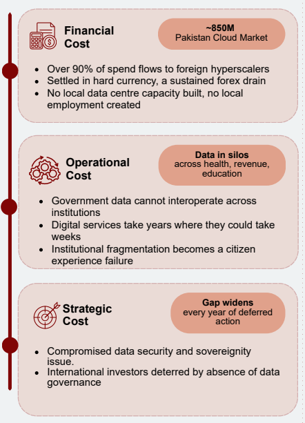 Pakistan has the policy. It has the institutions. What it does not yet have is coherence, or the infrastructure to match its ambition. The Cloud First Policy set the right direction, but a cloud market now conservatively valued at approximately $800 million remains over 90% controlled by foreign hyperscalers, with an estimated $720 million or more leaving the country annually. Adoption is fragmented, awareness at the leadership level remains low, and the national digital vision has yet to translate into a unified execution posture. The cost is not abstract: it is measured in forex outflow, siloed government data, constrained IT export growth, and a widening gap to regional peers already building toward Sovereign Cloud and Sovereign AI. This paper maps that gap and points a clear direction forward.