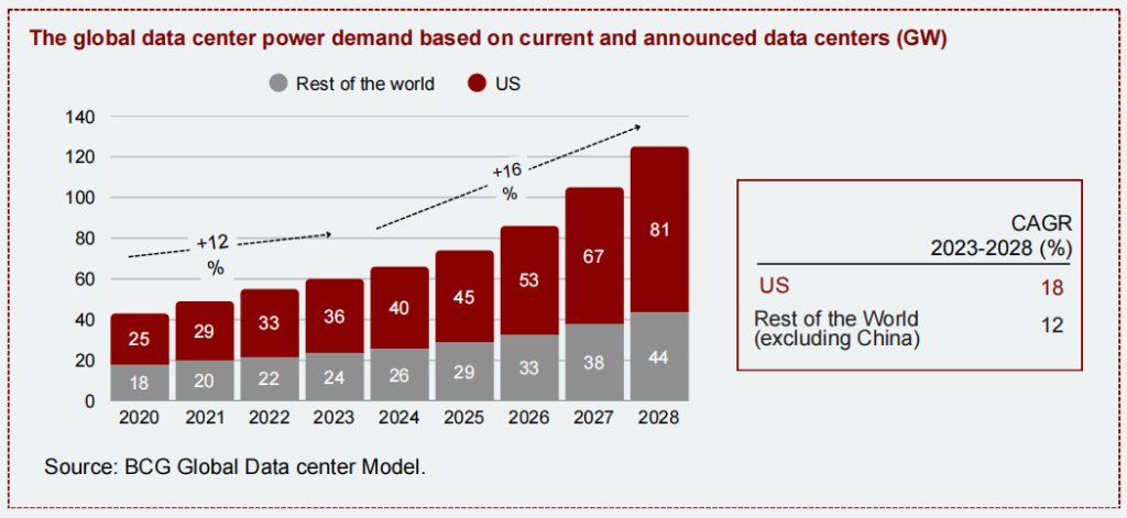 Global demand for data-centre electricity is projected to expand at approximately ~16% CAGR between 2023 and 2028, reaching ~125–130 GW by 2028, reflecting a clear acceleration relative to the early2020s baseline. Within this expansion, the United States is expected to remain the single largest datacentre market, with power demand growing at an estimated ~18% CAGR over the same period,